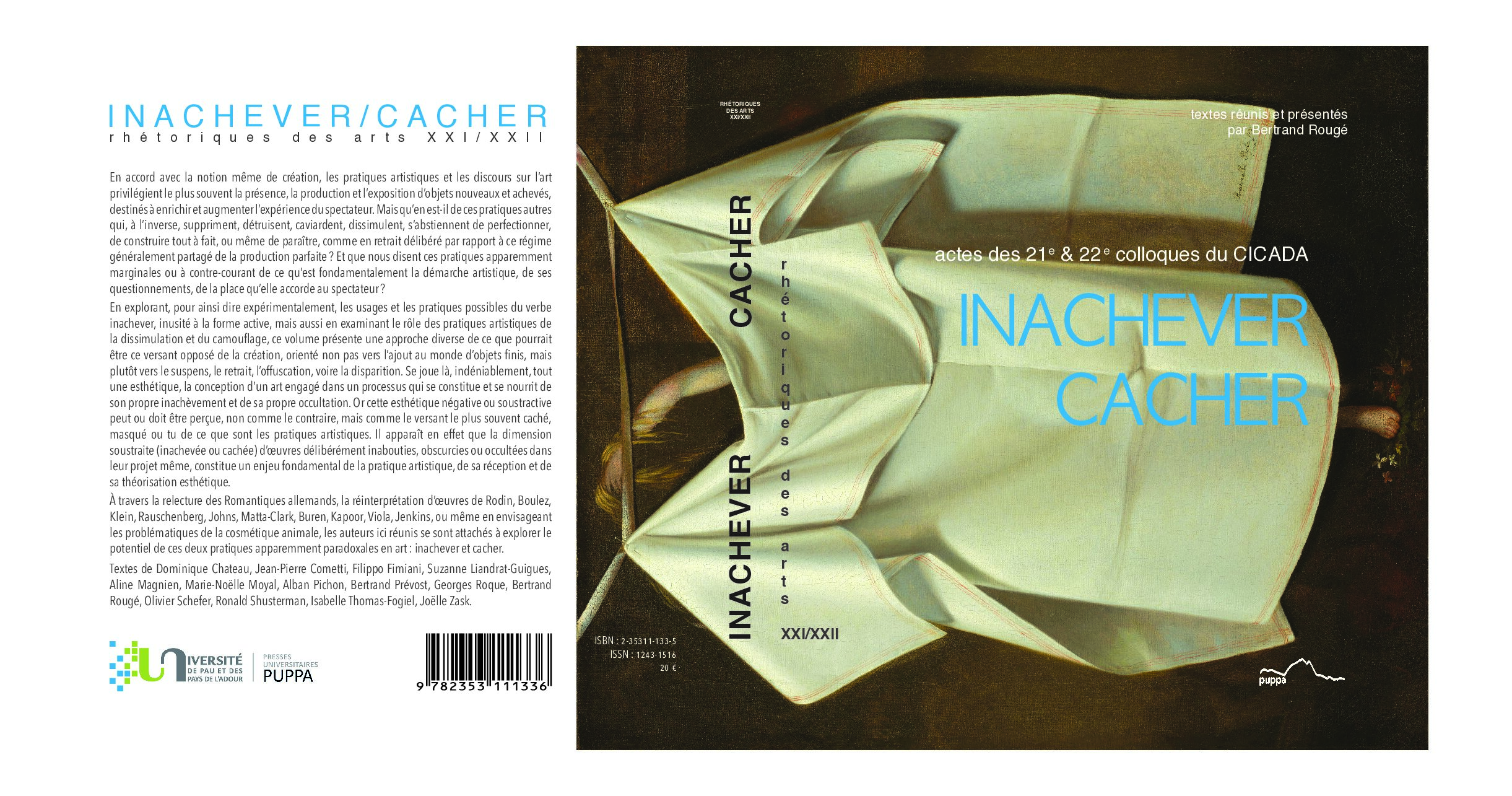 À travers la relecture des Romantiques allemands, la réinterprétation d’œuvres de Rodin, Boulez, Klein, Rauschenberg, Johns, Matta-Clark, Buren, Kapoor, Viola, Jenkins, ou même en envisageant les problématiques de la cosmétique animale, les auteurs ici réunis se sont attachés à explorer le potentiel de ces deux pratiques apparemment paradoxales en art : inachever et cacher.