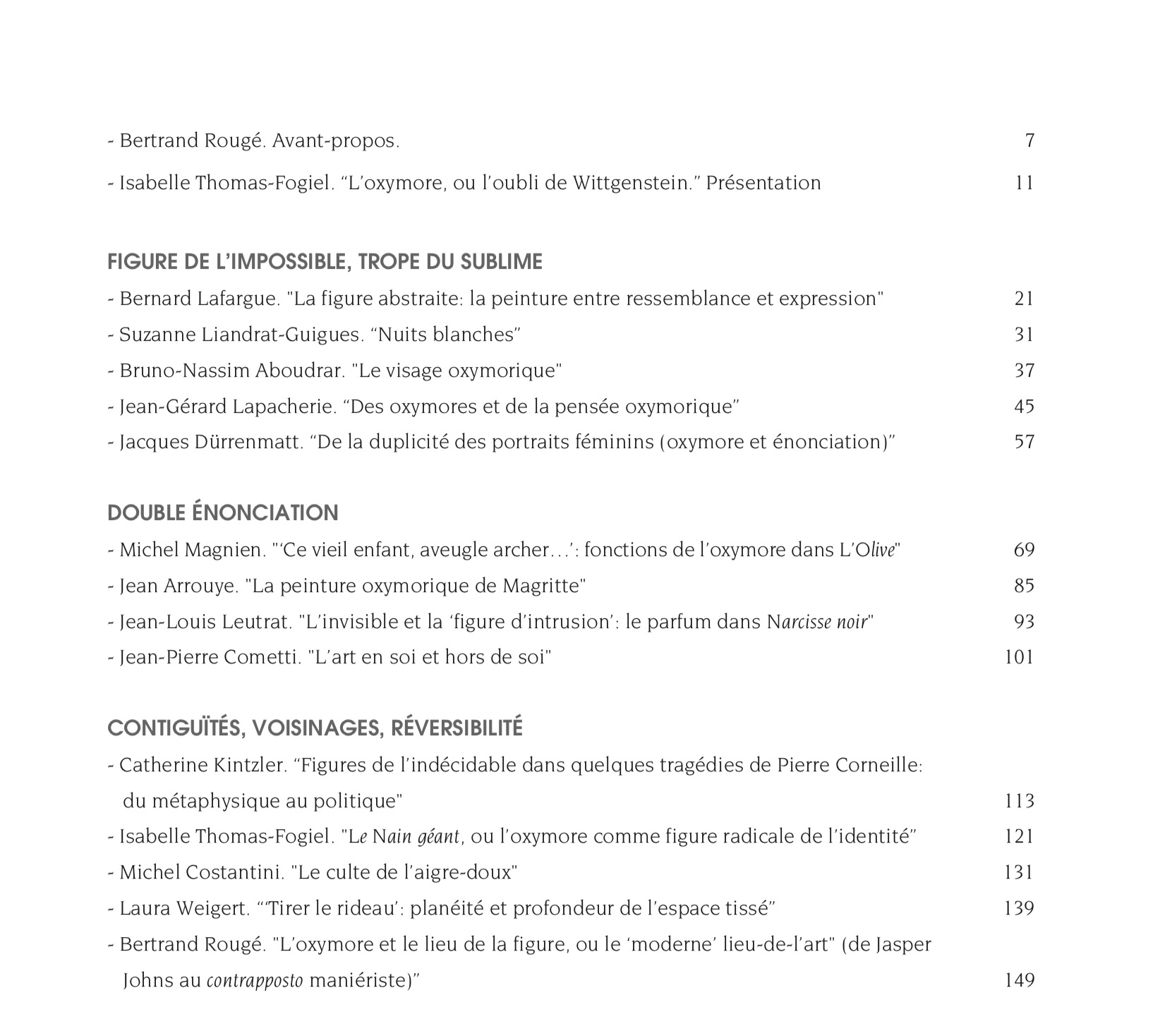 Les disciplines et les hypothèses ici réunies, s’attachant à étudier ce lien particulier et fort entre l’opération oxymorique, la production artistique et l’expérience esthétique, ont permis d’identifier trois possibilités de définition pertinente de l’oxymore, trois manières positives de penser la relation entre deux opposés, de nouer les contraires en un lien (et en un lieu) signifiant, plutôt que de les rejeter dans la zone des non-sens. La première envisage l’oxymore comme trope de l’impossible ou de l’irreprésentable, constat d’échec de la relation engendrant la dynamique du sublime. La deuxième décrit l’oxymore comme une double énonciation, la relation devenant signifiante par distinction des niveaux et restituant au réel sa véritable consistance polyphonique. La troisième envisage la mise en relation oxymorique sous la figure de la contiguïté, de l’enchevêtrement et de l’empiètement, non pas comme juxtaposition du « côte à côte », mais comme relevant plutôt de « l’un (tout) contre l’autre ». Dans une perspective interdisciplinaire, ces hypothèses sont ici explorées et développées à partir d’analyses d’oeuvres picturales, littéraires, cinématographiques et musicales.