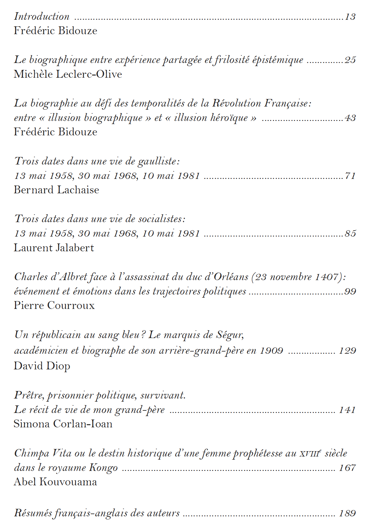 La biographie fascine, la biographie passionne et la biographie dérange aussi. L’évolution du genre a suscité jusqu’à nos jours de très nombreuses études et révélé à juste titre que l’exercice était un moyen comme un autre, dans la discipline historique, d’appréhender le temps et le sens de l’événement, entre la réalité et la fiction. Ce sens « biographique » entend expérimenter un autre champ épistémologique, celui d’une trajectoire humaine, comme il en est des sociétés, des communautés et des nations, au fil du temps. Le travail collectif réalisé dans cet ouvrage a pour objectif de faciliter les approches en terme de croisements, de décrochements entre des destins communs qui deviennent par eux-mêmes singuliers, identifiés à des engagements qui font tant pour la postérité, la légende noire ou dorée non seulement de l’individu et de sa trajectoire, mais également du monde qui les entoure. Les différences de constructions sociales et politiques entre les aires géographiques, comme dans ce volume où la France côtoie à la fois l’Afrique et un ex-pays communiste comme la Roumanie, méritent d’être soulignées.